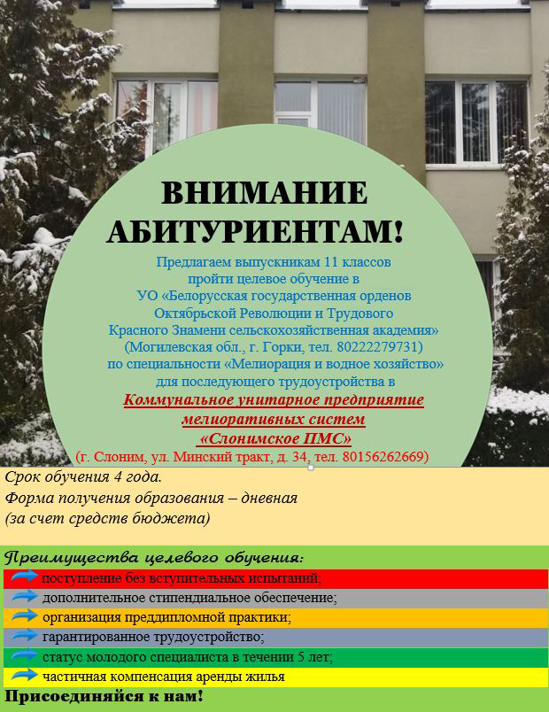 Абитуриенты смогут пройти обучение в престижном аграрном вузе страны — УО «Белорусская государственная орденов Октябрьской Революции и Трудового Красного Знамени сельскохозяйственная академия» (г. Горки, Могилевская обл.). После получения диплома выпускников ждет гарантированное трудоустройство в Коммунальном унитарном предприятии мелиоративных систем «Слонимское ПМС» (г. Слоним, ул. Минский тракт, д. 34).